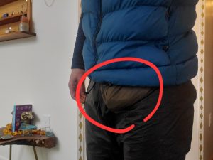 First, if that weight is such that it is sagging the pocket bag down this low, it’s worth questioning whether this is an item that is appropriate for carrying in a puffy garment. Things that are this heavy will have a negative effect on the loft that keeps you warm, even in a design like this that aims to mitigate it. Second, if you decide that this is where you want to store this item, the situation can be remedied by cinching up your bottom drawcord. By doing this, you take the weight off of the garment and place it onto the cinched cord, which transfers the weight directly onto your body, instead of hanging off the garment. This also keeps the item tucked up in the garment, instead of hanging below. Easy peasy!!