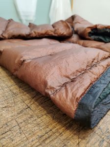 I recently retrieved the very first prototype of the SUL .75, which should make it about 8 years old. This is the lowest density and calculated loft of any item we make…..so the most susceptible to showing gaps if fill power is compromised. It’s been used hard and modified a few times. It’s been a sweater, a 1/4 zip, and a full zip. It’s been used as a strict static layer, a casual jacket, and even been abused as a semi-active and active layer. It’s been smooshed, sweated in, abraded, rained and snowed on, etc by several different people. It got to the point where there was a little bit of noticeable loft loss and clumping, which is the very moment I’ve been waiting for!