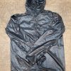 1.8 ounces! (medium basic pullover). This jacket is available as a super simple and super ultralight pullover or with some added adjustment. It’s constructed from Argon 90, which is a 15d fabric that has a little more durability than lower denier shell fabrics and has been tested to have 40 CFM breathability. A medium jacket with all the features is approzimately 3.5oz. The hood on zippered jackets has a face shock cord and a rear cinch so the hood can be loose fitting or snug. The cuffs have elastic openings. The pullover version gets an ultralight crossover hood and elastic cuffs.